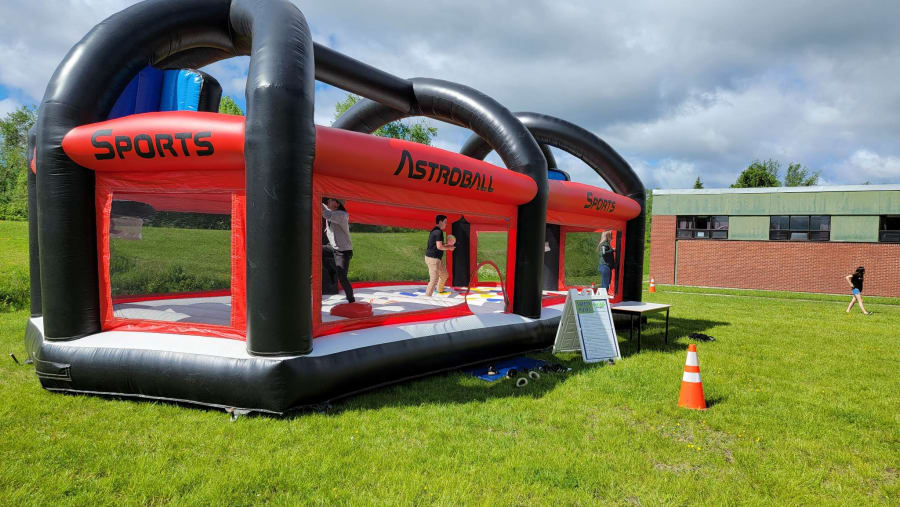 Sport Arena, can accommodate up to 8 adults or 12 children. It is a great one stop shop for entertainment! 5 different games can be played in the arena including basketball, volleyball, jousting, and dodge ball as well as simply bouncing and having a great time.